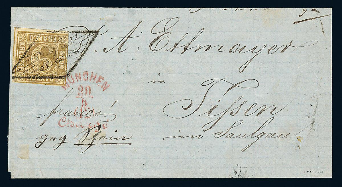| Zusatzinformationen und Suchstichworte: | 114. Kirstein-Larisch Auktion 1. - 3. Juni 2023 Los 177 Altdeutschland Bayern VERSUCHSSTEMPEL "325" von München, kpl. sauberer Abschlag auf 9 Kr. ockerbraun (oben u. links tls. ber./ angeschn., ansonsten breitrandig (kpl. SL unten)), farbfrische EF auf portoger. Pracht- Chargé- Faltbrief für die 3. Entfernungszone (6 Kr. Chargégebühr mussten bar entrichtet werden) mit beiges. roten L5 "MÜNCHEN Chargé 29 5 (12)" nach Tissen, 1866, als alleinige Entwertung sehr selten, gepr. Pfenninger, neuestes Fotoattest Stegmüller Zuschlag 560,00 EUR |
