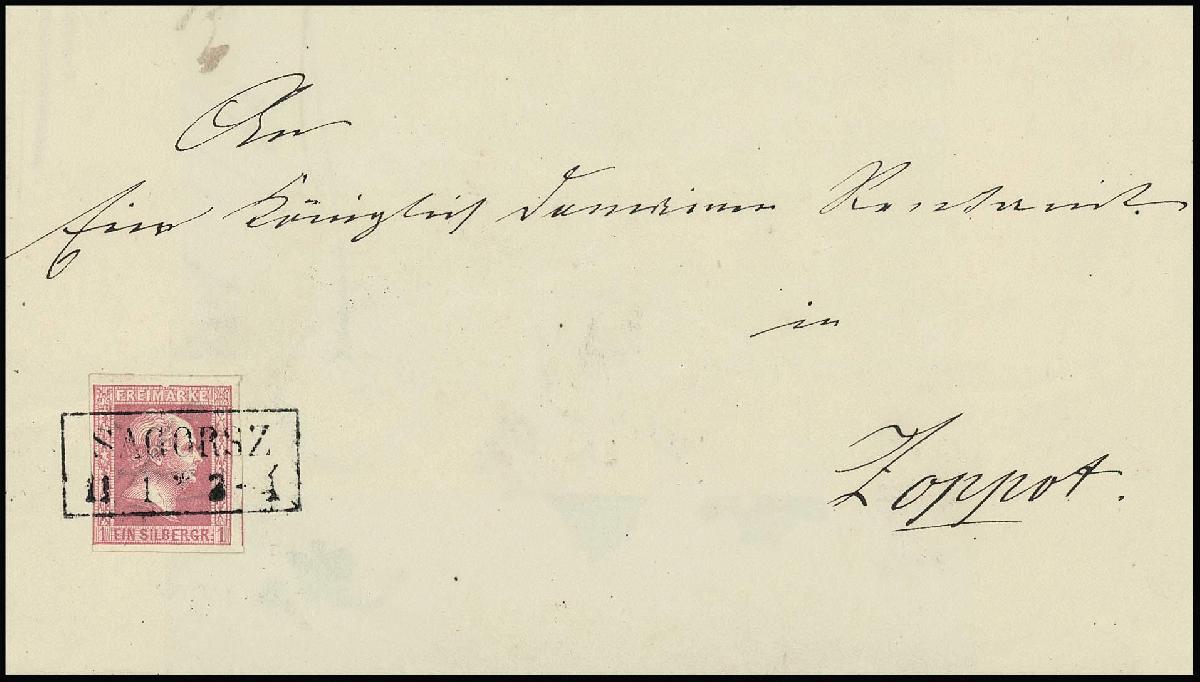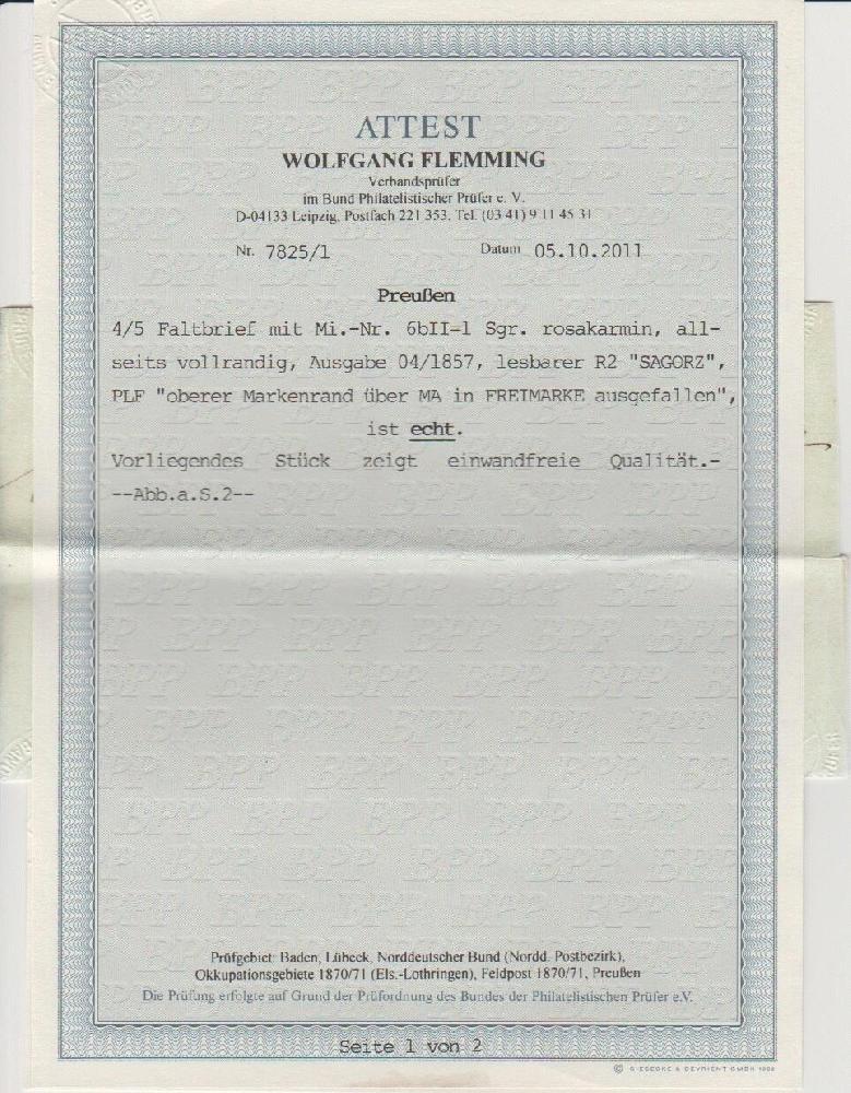 | Zusatzinformationen und Suchstichworte: | Rauhut & Kruschel - 218. Auktion 10. Juni 2023 Los 889 Altdeutschland Preussen 1 Sgr. karmin, noch voll- bis breitrandig, sehr gut sichtbarer Plattenfehler "Rand oben über MA gebrochen" auf Faltbrief (rs. gering verkürzt) mit geradem Ra2 "Sagorsz". Auf Brief ist der Plattenfehler selten und im Michel ohne Preis (lose 750,-), sign. Banker und Attest Flemming ("einwandfreie Qualität") Ausruf 180,00 EUR |