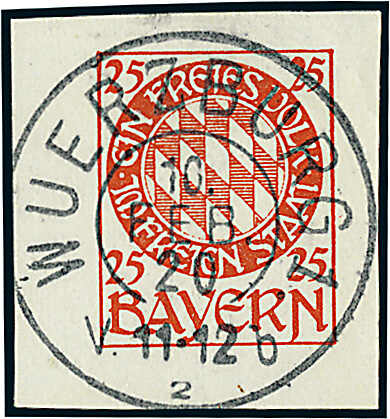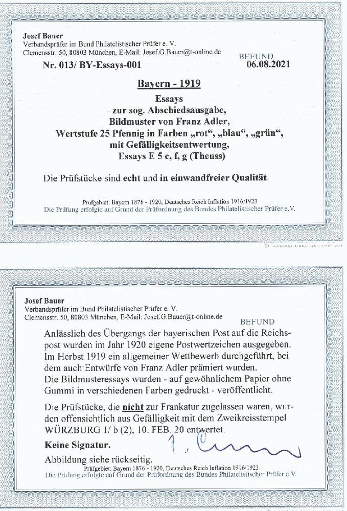 | Zusatzinformationen und Suchstichworte: | 114. Kirstein-Larisch Auktion 1. - 3. Juni 2023 Los 215 Altdeutschland Bayern 1919, Abschied, 25 Pf., 3 Pracht- Essays mit Wappenzeichnung von Franz Adler in rot, blau und grün mit Gefälligkeitsentwertung durch K2 "WUERZBURG 1. 10. FEB. 20", aktueller Fotobefund Bauer, Theuss E 5 c, f, g Ausruf 50,00 EUR |