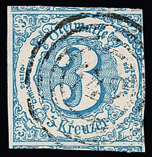 | Zusatzinformationen und Suchstichworte: | Rauhut & Kruschel - 218. Auktion 10. Juni 2023 Los 1394 Altdeutschland Thurn und Taxis 3 Kr. hellblau, zwei ungewöhnlich breitrandige gestempelte Luxus-/Kabinettstücke, je dreiseitig Nebenmarken Ausruf 50,00 EUR |