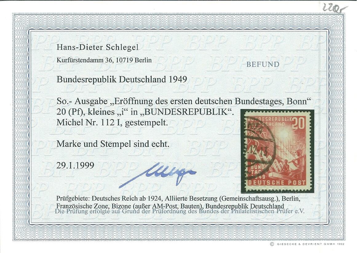 | Zusatzinformationen und Suchstichworte: | Rauhut & Kruschel - 218. Auktion 10. Juni 2023 Los 3272 Bundesrepublik Deutschland 20 Pfg. Bundestag, guter Plattenfehler "kleines i", sauber gestempelt, Fotoexp. Schlegel. Mi. 450,- Ausruf 80,00 EUR |