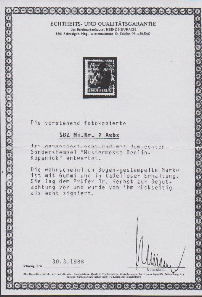 | Zusatzinformationen und Suchstichworte: | Rauhut & Kruschel - 218. Auktion 10. Juni 2023 Los 2955 Sowjetische Zone 6 Pfg. Berliner Bär in besserer Type gest., sign. Ströh. Mi. 300,- Ausruf 50,00 EUR |
