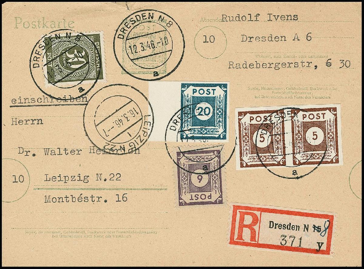 | Zusatzinformationen und Suchstichworte: | Rauhut & Kruschel - 218. Auktion 10. Juni 2023 Los 2981 Sowjetische Zone Ganzsachenkarte 6 Pfg. olivgrün, seltene b-Farbe, übergroß und stark verschnitten, mit schwachem Wertstempel-Eindruck als portogerecht frankierte R-Karte ab "Dresden", 12.3.46, nach Leipzig mit Ankunftsstempel. Wie üblich bei diesen Karten oben mit Knitterbügen bzw. ein Einriß, dennoch sehr seltenes, echt gelaufenes Exemplar. Fotoattest Dr. Jasch. Mi. 800,- Ausruf 110,00 EUR |