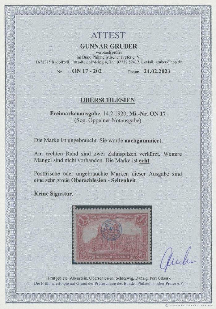 | Zusatzinformationen und Suchstichworte: | Ulrich Felzmann 178. Auktion 22. Juni 2023 Los 3307 Ost-Oberschlesien Oppelner Notausgabe 1 Mk dunkelkarminrot mit sehr schön klar und annähenrd kopfstehend aufsitzendem Handstempelaufdruck, nachgummiert mit rechtsseitig zwei verkürzten Zahnspitzen, darüber hinaus einwandfrei und farbfrisch, Fotoatteste Weinberg sowie Gruber BPP "Postfrische oder ungebrauchte Marken dieser Ausgabe sind eine sehr große Oberschlesien-Seltenheit" Ausruf 800,00 EUR |