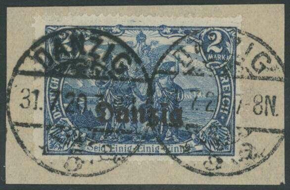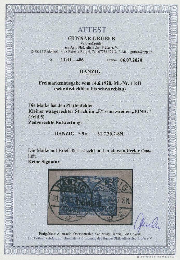| Zusatzinformationen und Suchstichworte: | Ulrich Felzmann 178. Auktion 22. Juni 2023 Los 3308 Danzig 2 Mk Germania schwarzblau mit Plattenfehler "kleiner waagerechter Strich im E vom zweiten EINIG", attraktives weißes Pracht-Briefstück, klar und zeitgerecht gestempelt DANZIG 31.7..20, Fotoattest Gruber BPP "... in einwandfreier Qualität" Ausruf 600,00 EUR |