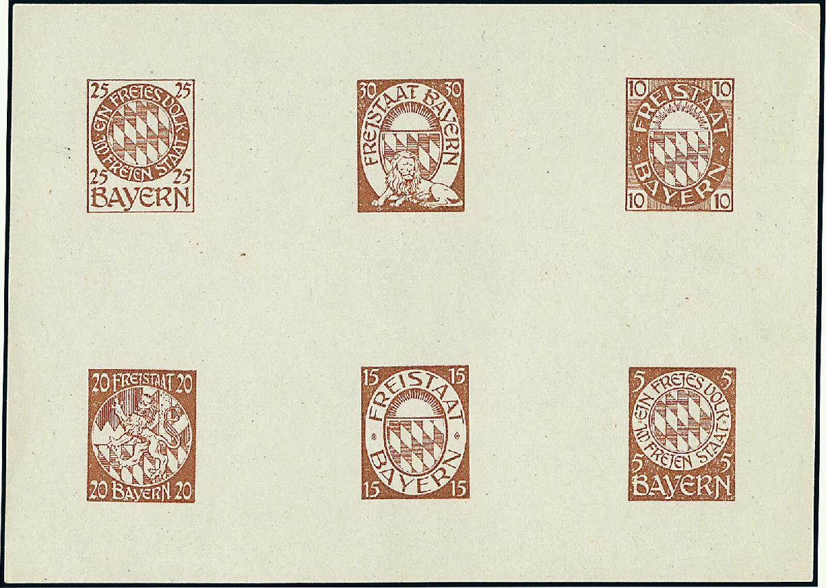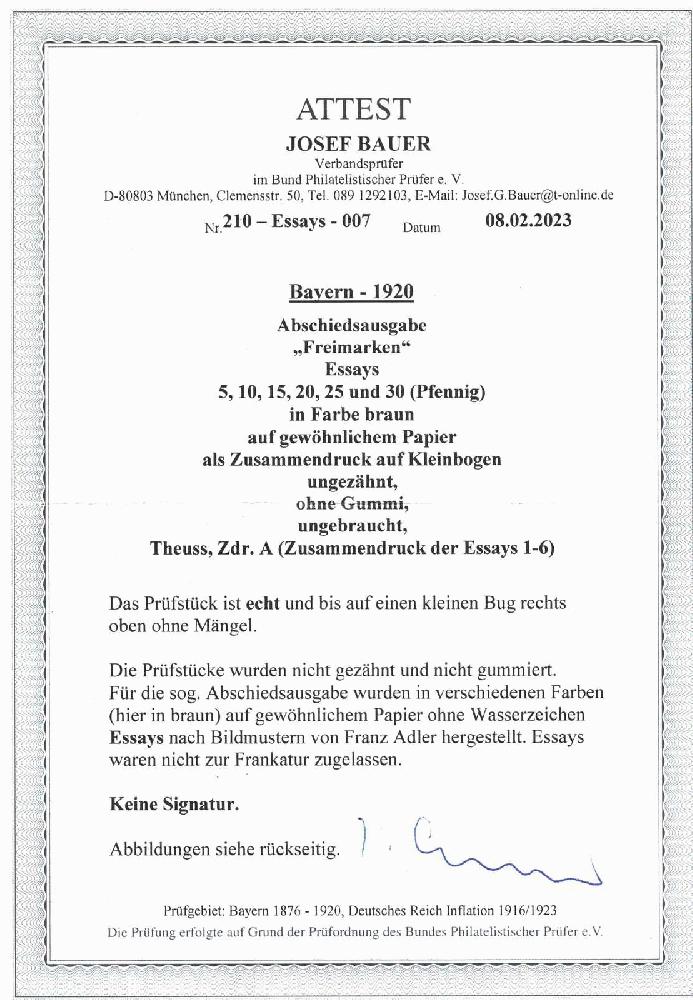 | Zusatzinformationen und Suchstichworte: | 114. Kirstein-Larisch Auktion 1. - 3. Juni 2023 Los 216 Altdeutschland Bayern ESSAYS, Wappen u. Löwe, 5-30 Pf. braun, Pracht- Klbg. (Eckbug) mit 6 verschied. Essays v. Franz Adler, Theuss Zdr. A, neuestes Fotoattest Bauer Zuschlag 70,00 EUR |