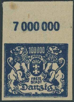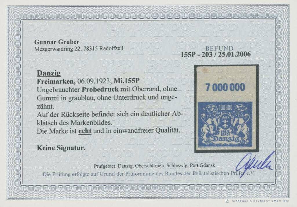 | Zusatzinformationen und Suchstichworte: | Ulrich Felzmann 178. Auktion 22. Juni 2023 Los 3318 Danzig 100.000 Mk kleines Wappen graublau, ungezähnter Probedruck auf ungummiertem Papier mit rs. klarem Abklatsch des Markenbildes, besonders attraktives Oberrandstück mit kleinem Einschluss in einwandfreier Prachterhaltung, Ausruf 150,00 EUR |