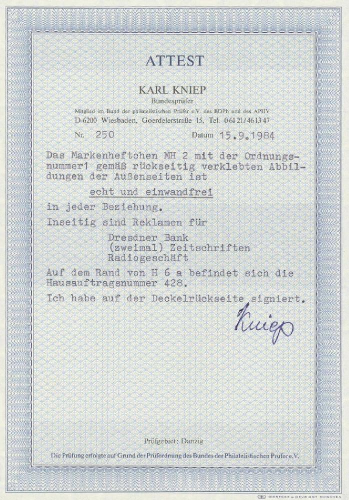 | Zusatzinformationen und Suchstichworte: | Ulrich Felzmann 178. Auktion 22. Juni 2023 Los 3319 Danzig Staatswappen 1928, vollständiges Markenheftchen mit Ordnungsnummer "1" und allen Heftchenblättern, Pracht, sign. Kniep BPP mit Fotoattest "einwandfrei", € 6.500,- Ausruf 2.000,00 EUR |