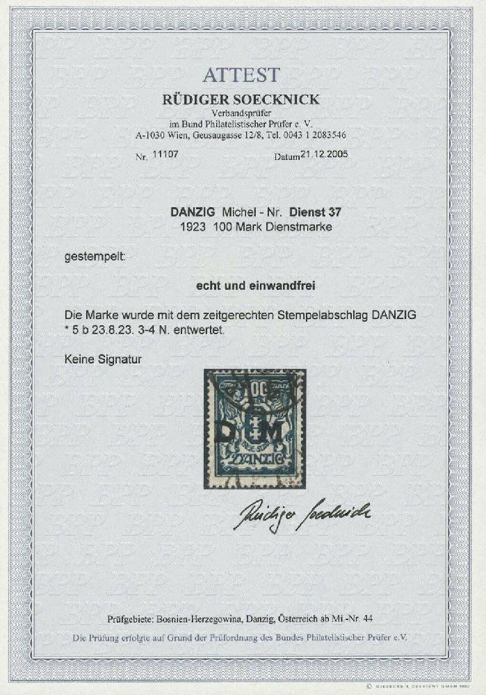 | Zusatzinformationen und Suchstichworte: | Ulrich Felzmann 178. Auktion 22. Juni 2023 Los 3321 Danzig 100 Mk schwärzlicholivgrün, zeitgerecht gestempelt DANZIG 23.8.23, Fotoattest Soecknick BPP "... einwandfrei" Ausruf 100,00 EUR |