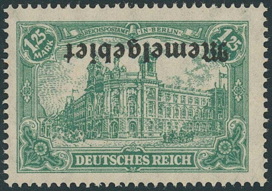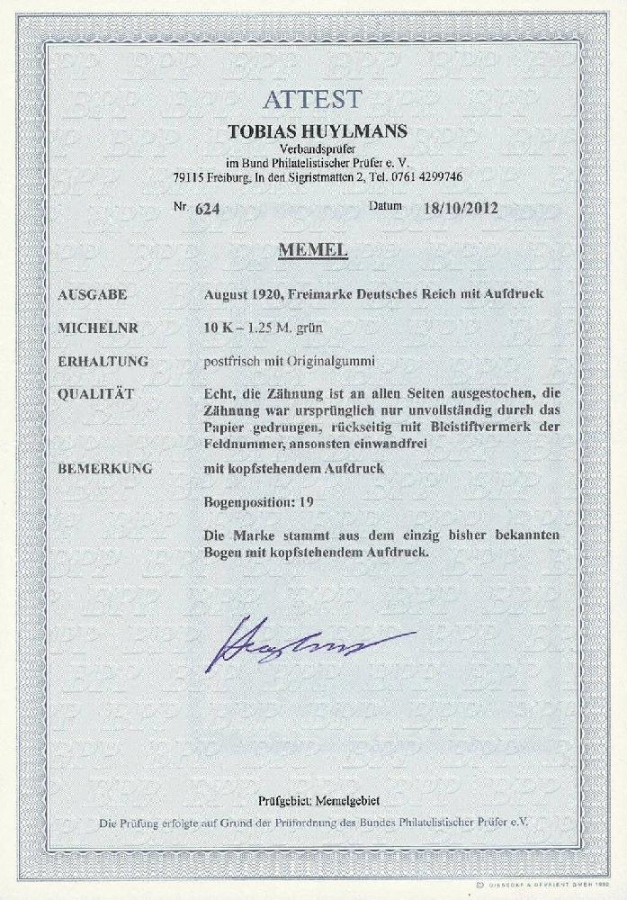 | Zusatzinformationen und Suchstichworte: | Ulrich Felzmann 178. Auktion 22. Juni 2023 Los 3325 Memel 1,25 Mk grün mit kopfstehendem Aufdruck, Bogenposition 19 dieser seltenen Marke mit rs. zartem kleinen Bleistiftvermerk der Feldnummer, einwandfrei postfrisch mit ausgestochenen Zähnungslöchern der ursprünglich nicht vollständig ausgestanzten Perforation, wie bei allen anderen bekannten Marken auch, Fotoattest Huylmans BPP "... einwandfrei, ... aus dem einzig bisher bekannten Bogen" Ausruf 1.200,00 EUR |