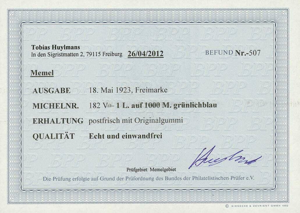 | Zusatzinformationen und Suchstichworte: | Ulrich Felzmann 178. Auktion 22. Juni 2023 Los 3336 Memel 1 L auf 1000 Mk grünlichblau mit guter Aufdruck-Type V (+ 200 %), tadellos postfrisch in unsignierter Prachterhaltung, Fotobefund Huylmans BPP "... einwandfrei", € 600,- Ausruf 180,00 EUR |