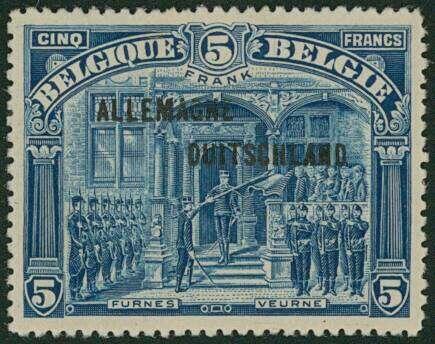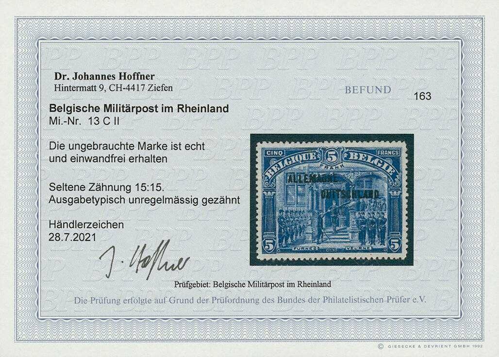 | Zusatzinformationen und Suchstichworte: | Ulrich Felzmann 178. Auktion 22. Juni 2023 Los 3302 Belgische Militärpost im Rheinland 5 Fr mit seltener, typisch unregelmäßiger enger Zähnung 15 in ungebrauchter Prachterhaltung, signiert mit Fotobefund Dr. Hoffner BPP "... einwandfrei erhalten" Ausruf 200,00 EUR |