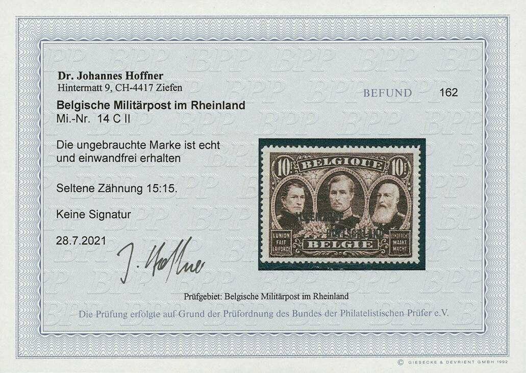 | Zusatzinformationen und Suchstichworte: | Ulrich Felzmann 178. Auktion 22. Juni 2023 Los 3303 Belgische Militärpost im Rheinland 10 Fr mit seltener enger Zähnung 15 in ungebrauchter Prachterhaltung, unsigniert mit Fotobefund Dr. Hoffner BPP "... einwandfrei erhalten" Ausruf 200,00 EUR |