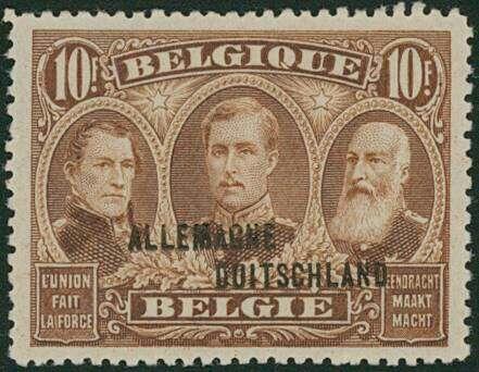| Zusatzinformationen und Suchstichworte: | Ulrich Felzmann 178. Auktion 22. Juni 2023 Los 3304 Belgische Militärpost im Rheinland 10 Fr mit enger Aufdrucktype und seltener enger Zähnung 15 in ungebrauchter Prachterhaltung, unsigniert mit Fotobefund Dr. Hoffner BPP "... einwandfrei erhalten" Ausruf 100,00 EUR |