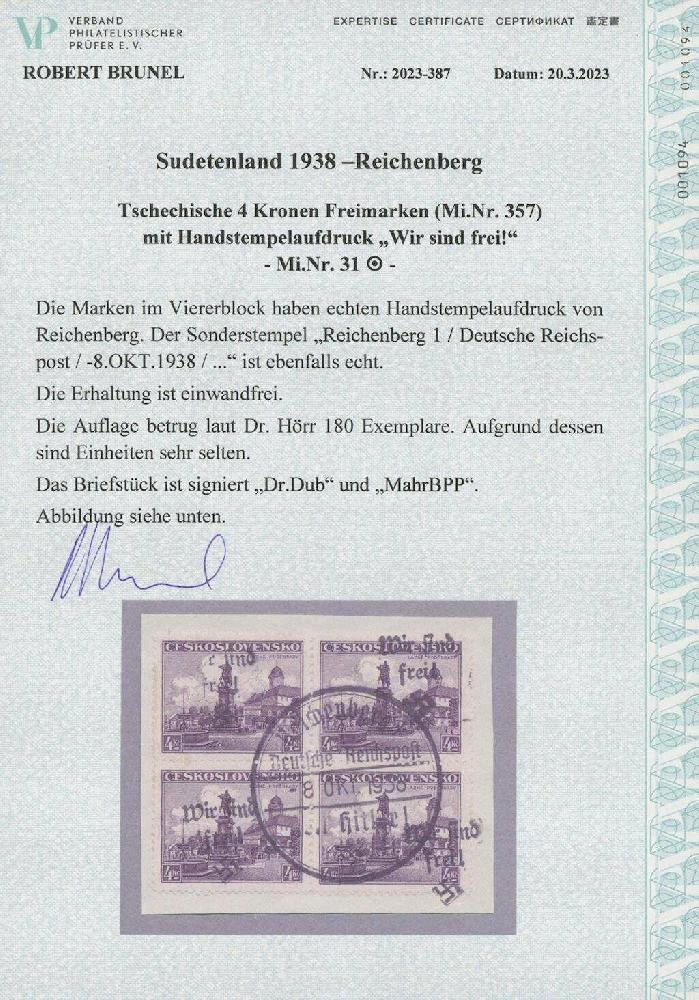 | Zusatzinformationen und Suchstichworte: | Ulrich Felzmann 178. Auktion 22. Juni 2023 Los 3384 Sudetenland Reichenberg Maffersdorf 4 Kc Bad Podiebrad im Viererblock mit zentrischem SST auf einmalig attraktivem Pracht-Briefstück, u.a. sign. Mahr BPP sowie Fotoattest Brunel "... einwandfrei. Die Auflage betrug laut Dr. Hörr 180 Exemplare. Aufgrund dessen sind Einheiten sehr selten", € 800,- Ausruf 200,00 EUR |