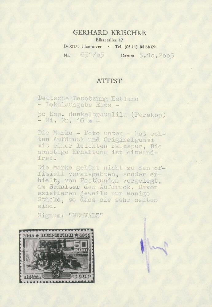 | Zusatzinformationen und Suchstichworte: | Ulrich Felzmann 178. Auktion 22. Juni 2023 Los 3393 Deutsche Besetzung II. WK Estland Elwa 50 K Perekop mit nur leichter, nahezu unsichtbarer Falzspur in ungebrauchter Top-Erhaltung, sign. Puloaas und Nemvalz sowie Fotoatteste Krischke und Löbbering BPP "... einwandfrei ...Bisher 6. zur Prüfung vorgelegtes Exemplar" Ausruf 800,00 EUR |