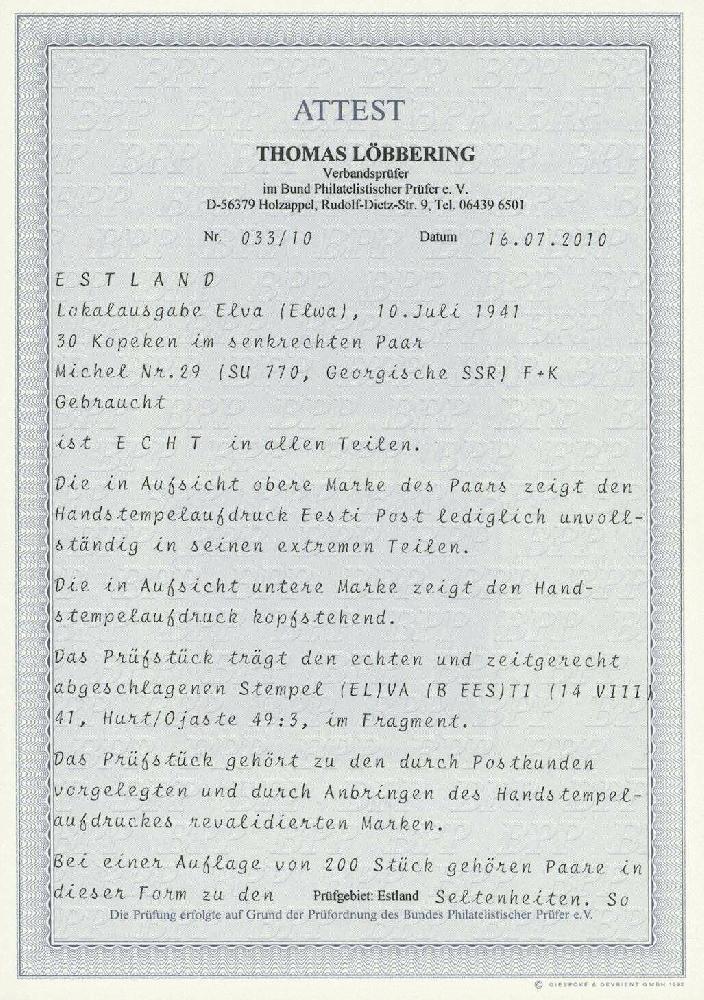 | Zusatzinformationen und Suchstichworte: | Ulrich Felzmann 178. Auktion 22. Juni 2023 Los 3394 Deutsche Besetzung II. WK Estland Elwa 30 K Georgische SSR im senkrechten Paar (!) mit oben fehlerhaftem und unten kopfstehend (!) angebrachtem Aufdruck, rs. leicht getönt mit zeitgerechtem Teilstempel in soweit tadelloser Erhaltung, aus den durch Publikumsvorlage revalidierten Exemplaren, u.a. signiert Vaher sowie gleich zweifach attestiert Löbbering BPP "bisher erstes zur Prüfung vorgelegtes Paar" Ausruf 2.800,00 EUR |