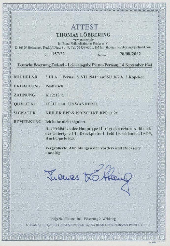 | Zusatzinformationen und Suchstichworte: | Ulrich Felzmann 178. Auktion 22. Juni 2023 Los 3398 Deutsche Besetzung II. WK Estland Lok Pernau 3 K gezähnt mit seltener Aufdrucktype mit größerer "9" von Feld 19 der Druckplatte 1, postfrisch in fehlerfreier Prachterhaltung Ausruf 400,00 EUR |