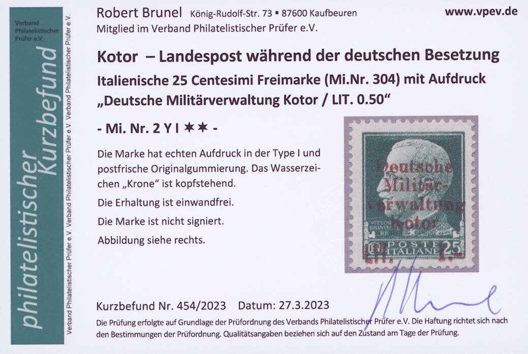 | Zusatzinformationen und Suchstichworte: | Ulrich Felzmann 178. Auktion 22. Juni 2023 Los 3406 Deutsche Besetzung II. WK Kotor 1 L auf 25 C mit kopftstehendem Wasserzeichen, Aufdruck Type I, tadellos postfrisch, leichter Eckbug, Fotobefund Brunel, € 350,- Ausruf 120,00 EUR |