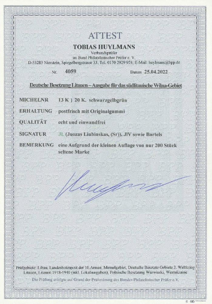 | Zusatzinformationen und Suchstichworte: | Ulrich Felzmann 178. Auktion 22. Juni 2023 Los 3416 Deutsche Besetzung II. WK Litauen 20 K mit kopfstehendem VILNIUS Aufdruck in tadellos postfrischer Prachterhaltung, mehrfach signiert sowie Fotoattest Huylmans BPP "... einwandfrei", € 500,- Ausruf 200,00 EUR |