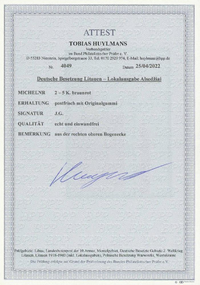 | Prüfgebiet: | Deutsche Besetzung WK 2 Litauen Alsedziai |