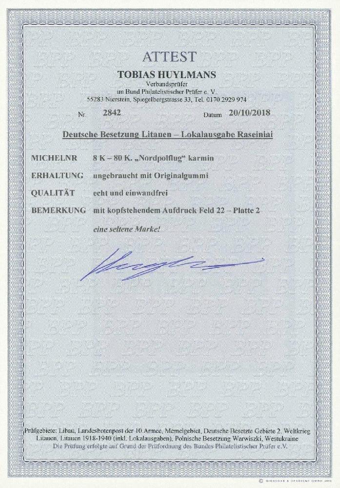 | Zusatzinformationen und Suchstichworte: | Ulrich Felzmann 178. Auktion 22. Juni 2023 Los 3421 Deutsche Besetzung II. WK Litauen ROSSINGEN, 80 K Nordpol mit kopfstehendem Aufdruck, ungebraucht mit nur geringen Haftspuren in bestens gezähnter Prachterhaltung, Fotoattest Huylmans BPP "... einwandfrei ... eine seltene Marke!", € 3.000,- Ausruf 750,00 EUR |
