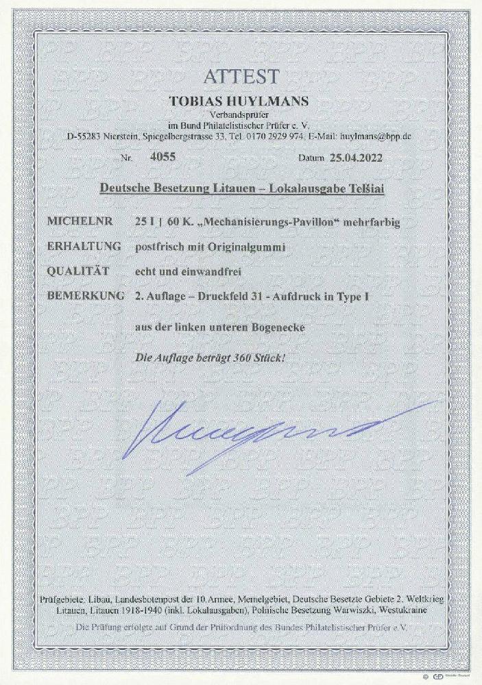 | Zusatzinformationen und Suchstichworte: | Ulrich Felzmann 178. Auktion 22. Juni 2023 Los 3424 Deutsche Besetzung II. WK Litauen TELSCHEN, 60 K Stalindenkmal, postfrische linke untere Bogenecke (!) in ungefalteter und unsignierter Prachterhaltung, Fotoattest Huylmans BPP "... einwandfrei" - Auflage nur 360 Exemplare Ausruf 150,00 EUR |