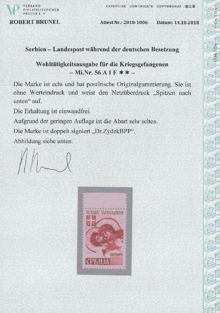 | Zusatzinformationen und Suchstichworte: | Ulrich Felzmann 178. Auktion 22. Juni 2023 Los 3429 Deutsche Besetzung II. WK Serbien 2 + 6 D Kriegsgefangene "Spitzen abwärts" ohne Werteindruck, ungefaltetes Oberrandstück (!) in tadellos postfrischer Prachterhaltung, doppelt sign. Zydek BPP sowie Fotoattest Brunel "... einwandfrei ... sehr selten", € 1.600,- Ausruf 500,00 EUR |