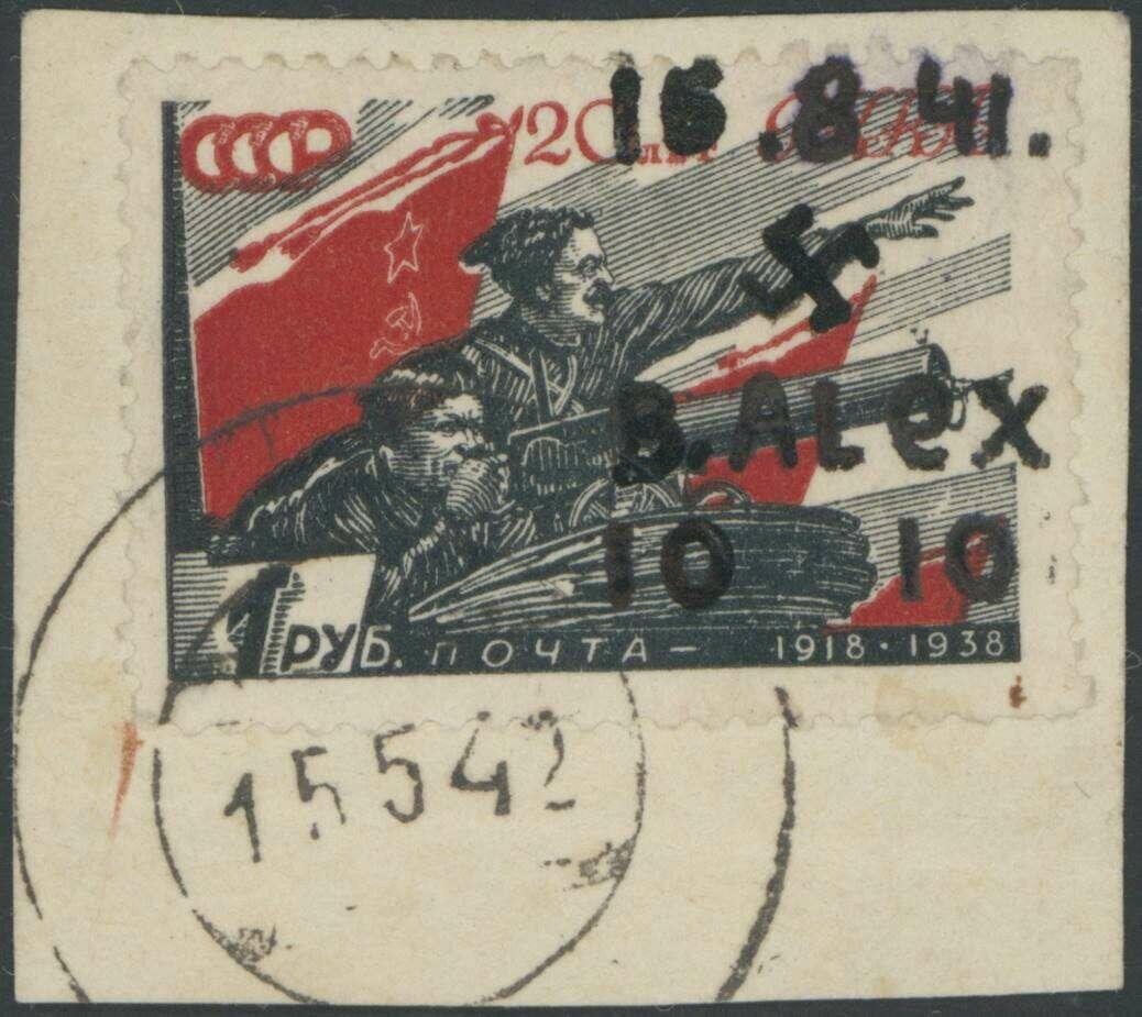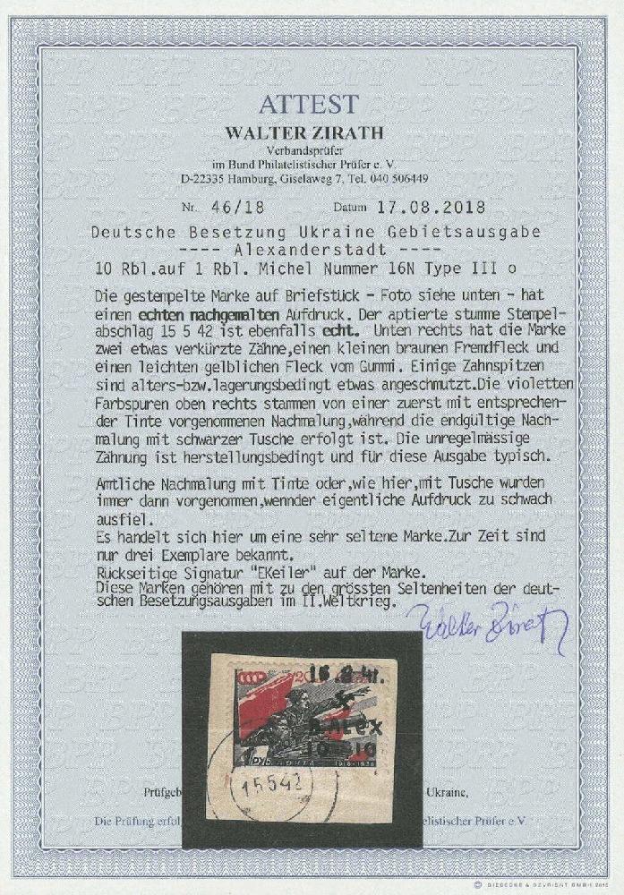 | Zusatzinformationen und Suchstichworte: | Ulrich Felzmann 178. Auktion 22. Juni 2023 Los 3432 Deutsche Besetzung II. WK Ukraine Alexanderstadt 10 R auf 1 R Tschpajew und Petjka "20 Jahre Rote Armee" mit amtlich nachgemaltem (!) Aufdruck in Type III, teils etwas kurze, letztendlich typisch unregelmäßige Zähnung mit wenigen Spuren, die angesichts der historischen Begleitbedingungen unvermeidlich waren, zeitgerecht gestempelt 15 5 42 in völlig ursprünglicher Erhaltung, signiert Keiler sowie Fotoatteste Krischke BPP "... äusserst selten. Bereits die Normalmarken dieses Wertes gehören mit zu den grössten Seltenheiten der deutschen Besetzungsausgaben im 2. Weltkrieg" sowie Zirath BPP "Zur Zeit [2018] sind nur drei Exemplare bekannt", € 64.000,- Ausruf 10.000,00 EUR |