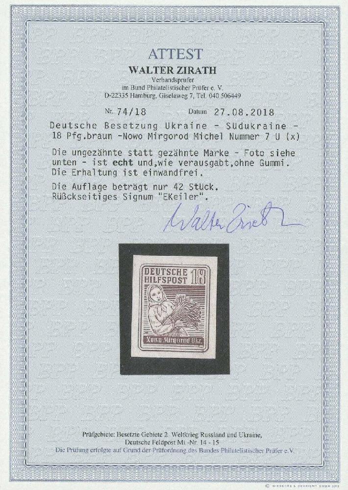 | Zusatzinformationen und Suchstichworte: | Ulrich Felzmann 178. Auktion 22. Juni 2023 Los 3434 Deutsche Besetzung II. WK Ukraine SÜDUKRAINE, 18 Pfg Nowo Mirgorod ungezähnt auf ungummiertem Papier, ringsum gleichmäßig breitrandig in tadelloser Erhaltung, sign. Keiler sowie Fotoatteste Krischke und Zirath BPP je "... einwandfrei. Die Auflage beträgt nur 42 Stück", € 3.000,- Ausruf 1.000,00 EUR |