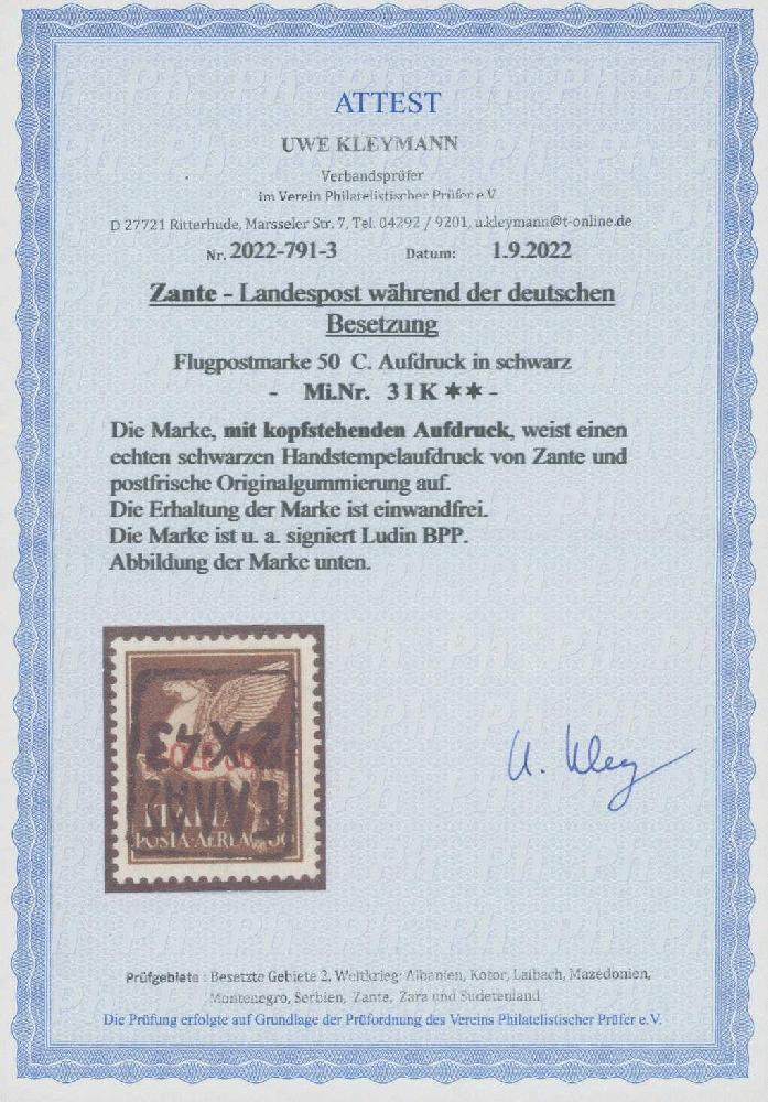 | Zusatzinformationen und Suchstichworte: | Ulrich Felzmann 178. Auktion 22. Juni 2023 Los 3438 Deutsche Besetzung II. WK Zante 50 C mit kopfstehendem schwarzem Aufdruck in tadellos postfrischer Prachterhaltung, u.a. sign. Ludin BPP sowie Fotoattest Kleymann "... einwandfrei" Ausruf 300,00 EUR |