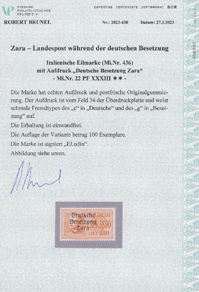 | Zusatzinformationen und Suchstichworte: | Ulrich Felzmann 178. Auktion 22. Juni 2023 Los 3439 Deutsche Besetzung II. WK Zara 2,50 L Eilmarke in seltener Aufdruck-Variante "schmale Typen des c und g", tadellos postfrisch, signiert Ludin sowie Fotoattest Brunel "... einwandfrei, Auflage 100 Exemplare", € 750,- Ausruf 300,00 EUR |