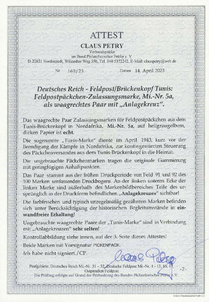 | Zusatzinformationen und Suchstichworte: | Ulrich Felzmann 178. Auktion 22. Juni 2023 Los 3441 Deutsche Besetzung II. WK, Feldpostmarken TUNIS Päckchenmarke, waagerechtes postfrisches Pracht-Paar auf hellgraugelbem dickem Papier, ungebraucht mit geringfügigen Haftpunkten, sign. Pickenpack sowie ausführliches Fotoattest Petry BPP "... in einwandfreier Erhaltung" Ausruf 300,00 EUR |