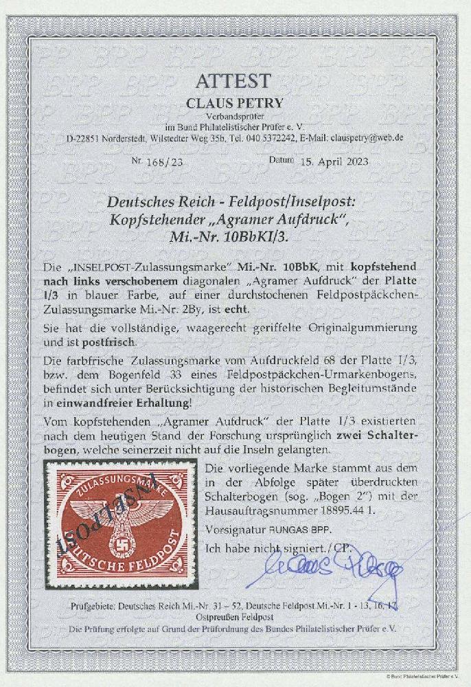 | Zusatzinformationen und Suchstichworte: | Ulrich Felzmann 178. Auktion 22. Juni 2023 Los 3450 Deutsche Besetzung II. WK, Feldpostmarken AGRAM durchstochen mit kopfstehendem blauem Aufdruck der Platte I/3, einwandfrei postfrisch, tadelloser Durchstich, farbfrisch und gut zentriert, signiert Rungas sowie Fotoattest Petry BPP "... in einwandfreier Erhaltung" Ausruf 150,00 EUR |