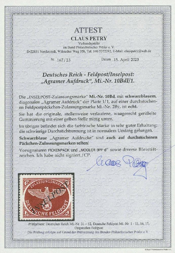 | Zusatzinformationen und Suchstichworte: | Ulrich Felzmann 178. Auktion 22. Juni 2023 Los 3451 Deutsche Besetzung II. WK, Feldpostmarken Agram durchstochen mit schwarzblauem diagonalem Aufdruck, Platte II, ungebraucht mit stellenweise verlaufener Gummierung und gelber Stelle mittig unten, mehrfach signiert sowie ausführliches Fotoattest Petry BPP Ausruf 90,00 EUR |