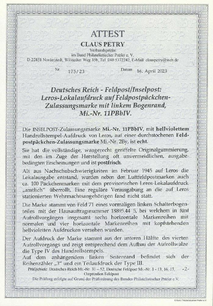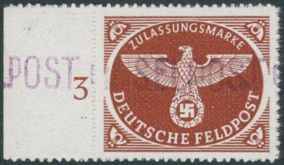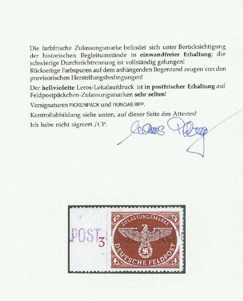 | Zusatzinformationen und Suchstichworte: | Ulrich Felzmann 178. Auktion 22. Juni 2023 Los 3457 Deutsche Besetzung II. WK, Feldpostmarken LEROS durchstochen mit hellviolettem Handrollstempel, postfrischer Probedruck mit waagerechter Gummiriffelung mit linkem Bogenrand, mehrfach sign. sowie ausführliches Fotoattest Petry BPP "... in einwandfreier Erhaltung" Ausruf 2.000,00 EUR |