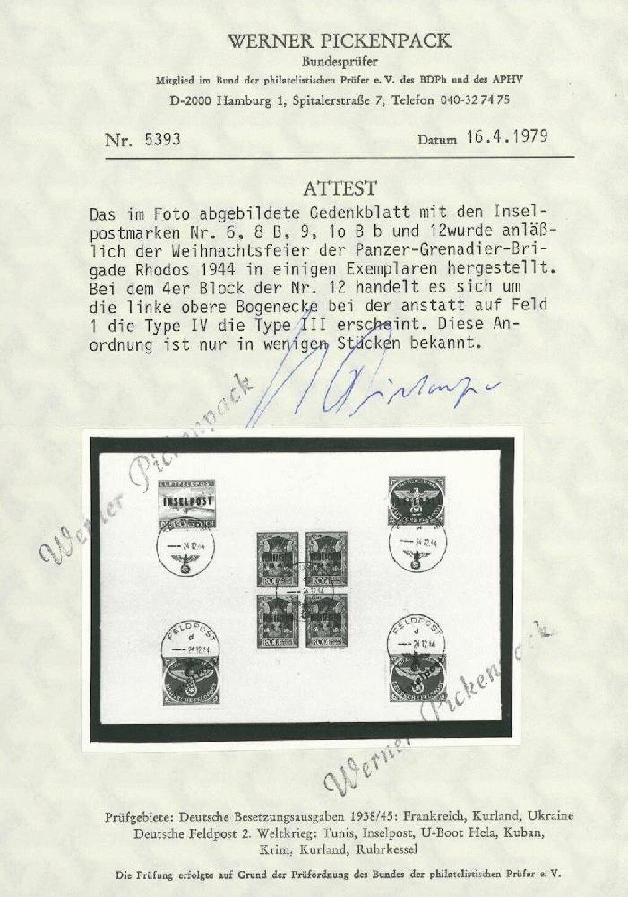 | Zusatzinformationen und Suchstichworte: | Ulrich Felzmann 178. Auktion 22. Juni 2023 Los 3458 Deutsche Besetzung II. WK, Feldpostmarken Rhodos Weihnachtsmarke im Viererblock der Felder 1-2 und 11-12, darunter einmal die seltene Variante "VEIHNACHTEN", nebst weiterer 4 verschiedener Inselpost Überdruckmarken im äußerst atraktiven Falt-Gedenkblatt der "PANZER-GRENADIER-BRIGADE RHODOS" anlässlich der Weihnachtsfeier 1944, ursprünglich patiniert in guter Gesamterhaltung, alle klar entwertet mit Feldpost Normstempeln "d" 24.12.44, Fotoattest Pickenpack Ausruf 800,00 EUR |