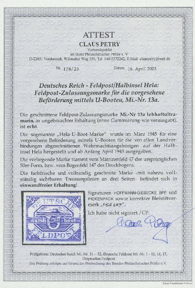 | Zusatzinformationen und Suchstichworte: | Ulrich Felzmann 178. Auktion 22. Juni 2023 Los 3459 Deutsche Besetzung II. WK, Feldpostmarken HELA U-Boot lebhaftultramarin, ungebrauchtes Prachtstück, wie verausgabt ohne Gummi, mehrfach signiert, Fotoattest Petry BPP "... einwandfrei" Ausruf 150,00 EUR |