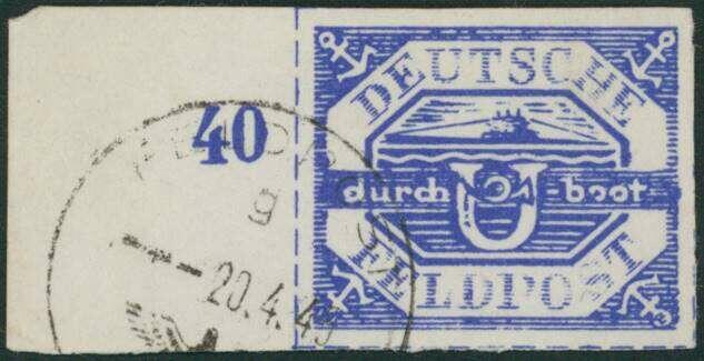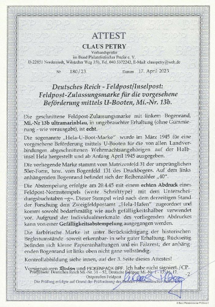 | Zusatzinformationen und Suchstichworte: | Ulrich Felzmann 178. Auktion 22. Juni 2023 Los 3462 Deutsche Besetzung II. WK, Feldpostmarken HELA U-Boot ultramarinblau, möglicherweise gefälligkeitshalber gestempeltes Prachtstück mit linkem Rand, klar erkennbarer Normstempel "g" 20.4.45, sign. Pickenpack sowie Fotoatest Petry BPP Ausruf 250,00 EUR |