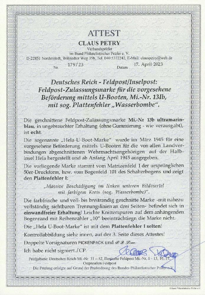 | Zusatzinformationen und Suchstichworte: | Ulrich Felzmann 178. Auktion 22. Juni 2023 Los 3463 Deutsche Besetzung II. WK, Feldpostmarken HELA U-Boot ultramarinblau mit Plattenfehler "Wasserbombe", Feld 101, ungebrauchtes Kabinettstück mit linkem Bogenrand, wie verausgabt ohne Gummi, mehrfach signiert, Fotoattest Petry BPP "... einwandfrei" Ausruf 400,00 EUR |