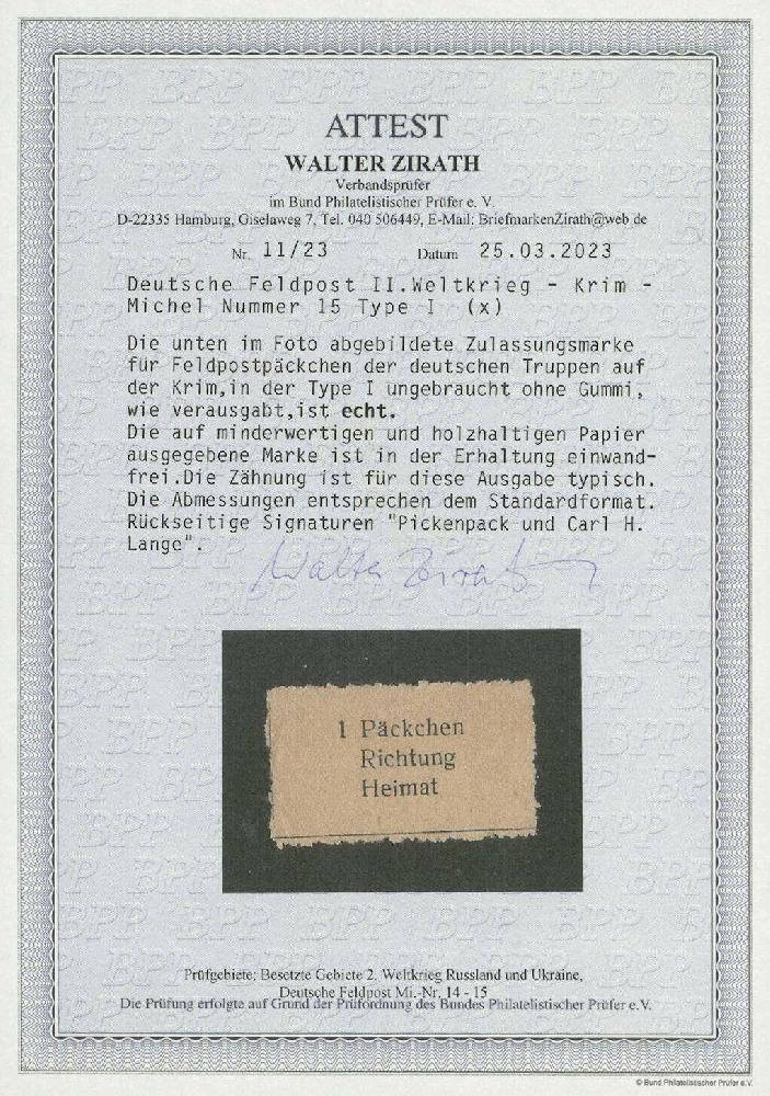 | Zusatzinformationen und Suchstichworte: | Ulrich Felzmann 178. Auktion 22. Juni 2023 Los 3464 Deutsche Besetzung II. WK, Feldpostmarken Krim Päckchen-Zulassungsmarke in Type I, ungebraucht ohne Gummi wie verausgabt, typisch unregelmäßig und einwandfrei gezähnt in fehlerfreier Pracht-Erhaltung, u.a. sign. Pickenpack und Carl H. Lange sowie Fotoattest Zirath BPP, € 1.600,- Ausruf 550,00 EUR |
