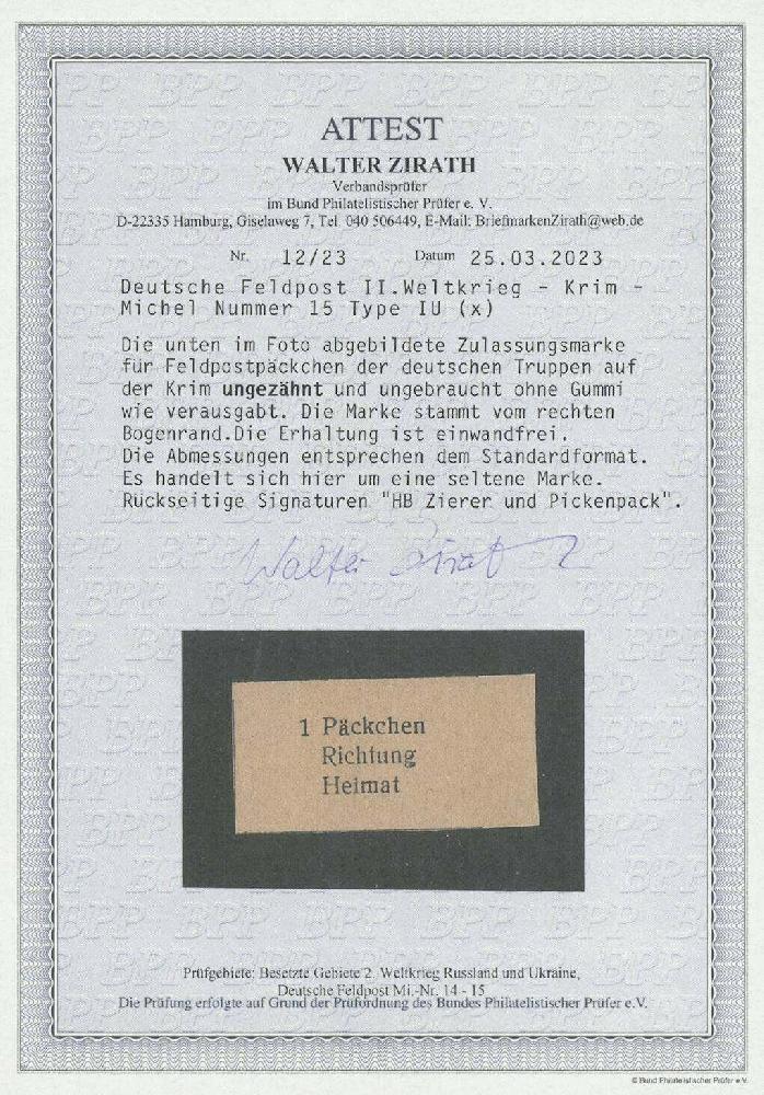 | Zusatzinformationen und Suchstichworte: | Ulrich Felzmann 178. Auktion 22. Juni 2023 Los 3465 Deutsche Besetzung II. WK, Feldpostmarken Krim Päckchen-Zulassungsmarke ungezähnt in Type I, ungebraucht ohne Gummi wie verausgabt, Pracht, u.a. sign. Pickenpack sowie Fotoattest Zirath BPP, € 2.500,- Ausruf 750,00 EUR |