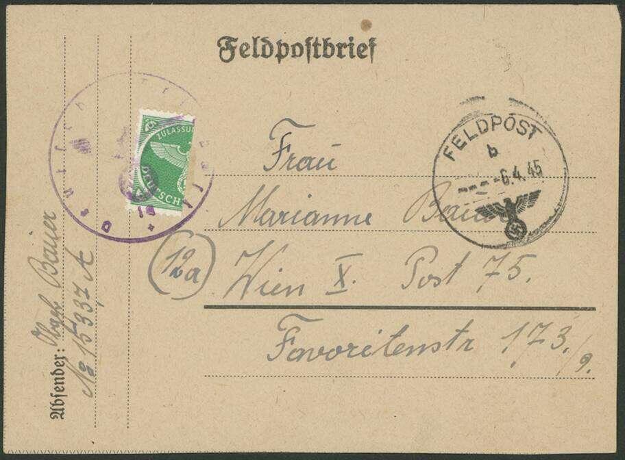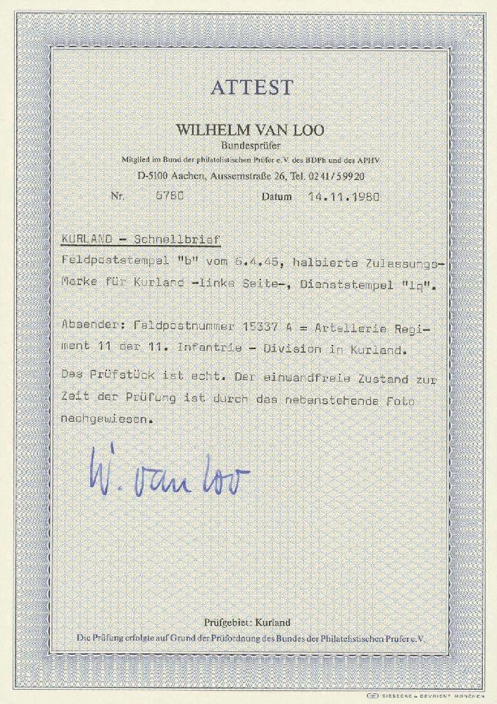 | Zusatzinformationen und Suchstichworte: | Ulrich Felzmann 178. Auktion 22. Juni 2023 Los 3466 Deutsche Besetzung II. WK, Feldpostmarken Kurland-Halbierung, linke Hälfte mit Dienstpoststempel auf Schnellbrief mit Normstempel "b" 6.4.45 und Absender Feldpostnummer 15337A (Artillerie Regiment 11) nach Wien, Fotoattest von Loo BPP, € 2.000,- Ausruf 500,00 EUR |