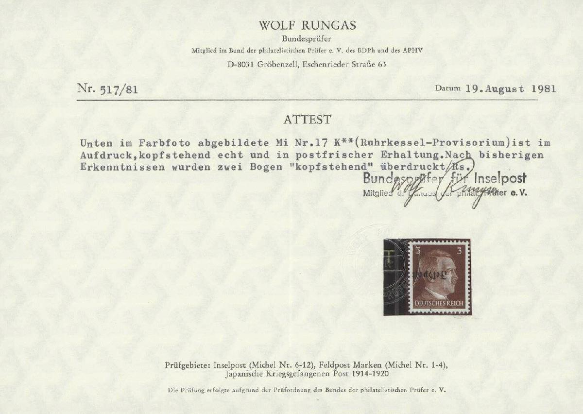 | Zusatzinformationen und Suchstichworte: | Ulrich Felzmann 178. Auktion 22. Juni 2023 Los 3467 Deutsche Besetzung II. WK, Feldpostmarken Ruhrkessel-Provisorium mit kopfstehendem Aufdruck auf 3 Pfg Hitler in postfrischer Prachterhaltung, mehrfach signiert, u.a. Rungas BPP mit Attest, € 1.000,- Ausruf 300,00 EUR |