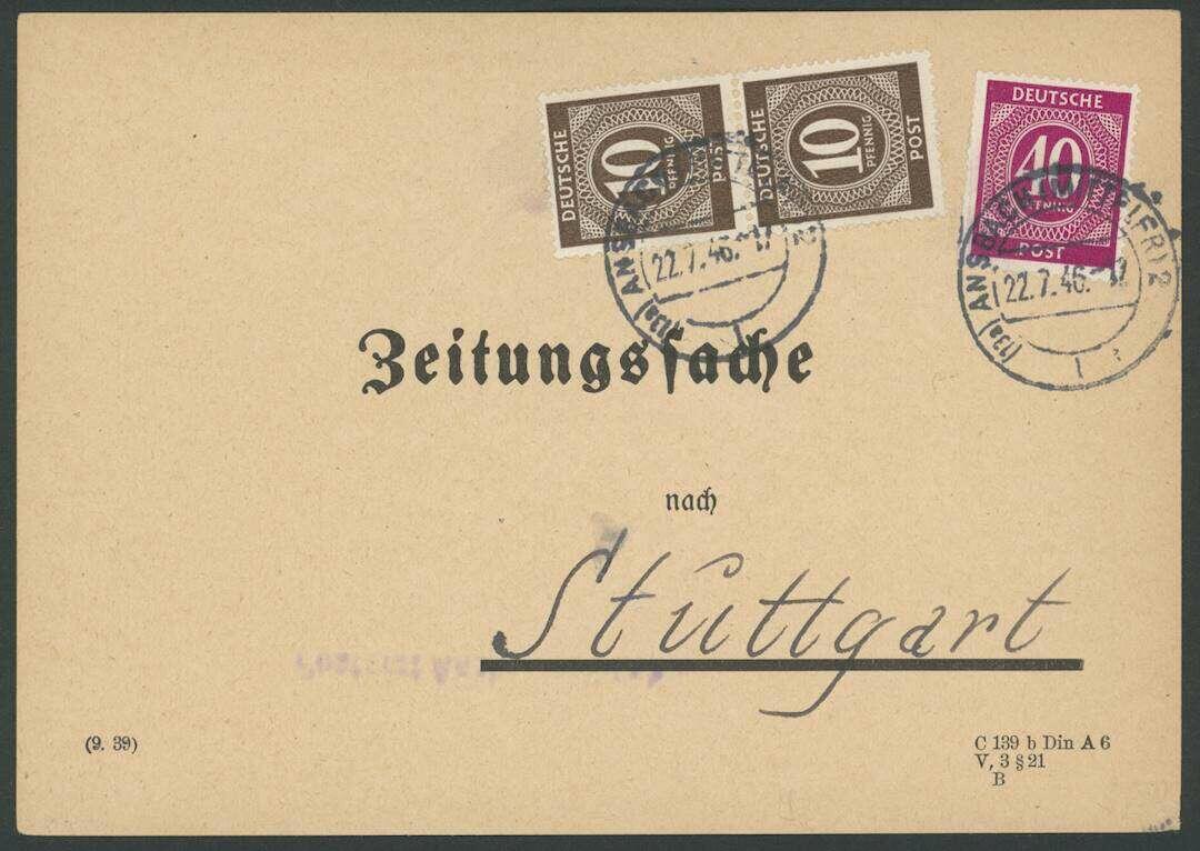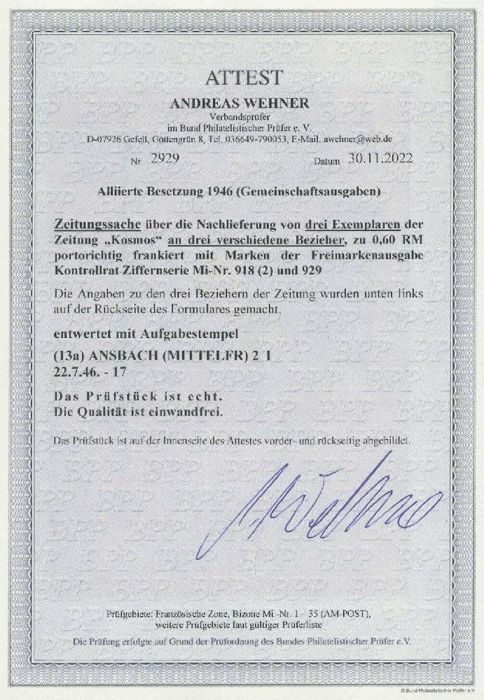 | Zusatzinformationen und Suchstichworte: | Ulrich Felzmann 178. Auktion 22. Juni 2023 Los 3503 Gemeinschaftsausgaben 40 Pfg und 2 x 30 Pfg Ziffer als MiF auf portogerechter Zeitungssache über die Nachlieferung von 3 Exemplaren an 3 versch. Empfänger ab ANSBACH 22.7.46, Fotoattest Wehner BPP "... einwandfrei" Ausruf 300,00 EUR |