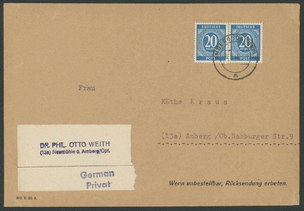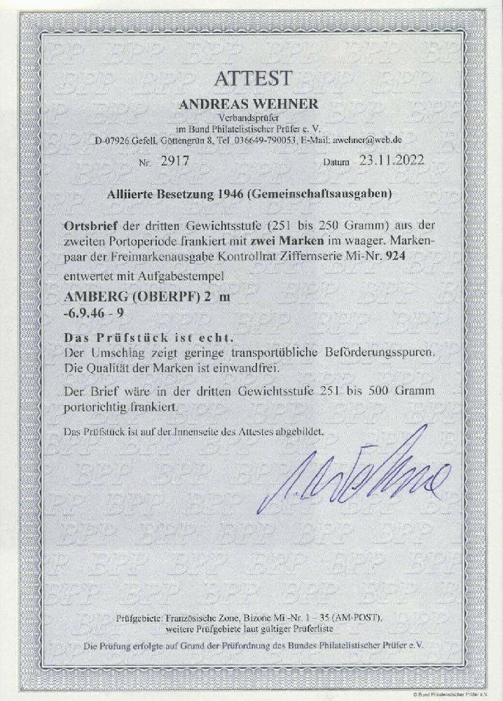 | Zusatzinformationen und Suchstichworte: | Ulrich Felzmann 178. Auktion 22. Juni 2023 Los 3504 Gemeinschaftsausgaben 20 Pfg Ziffer im waagerechten Paar als für die dritte Gewichtsstufe 251-500 Gramm portogerecht frankierte MeF auf Brief mit leichten Beförderungsspuren ab AMBERG 6.9.46, neuestes Fotoattest Wehner BPP Ausruf 500,00 EUR |