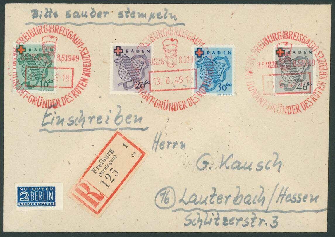 | Zusatzinformationen und Suchstichworte: | Ulrich Felzmann 178. Auktion 22. Juni 2023 Los 3599 Französische Zone Baden Rot-Kreuz-Satz mit rotem SST HENRI DUNANT auf philat. Fern-R-Brief mit rückseitigem Ankunftsstempel, Fotoattest Schlegel BPP, € 600,- Ausruf 120,00 EUR |