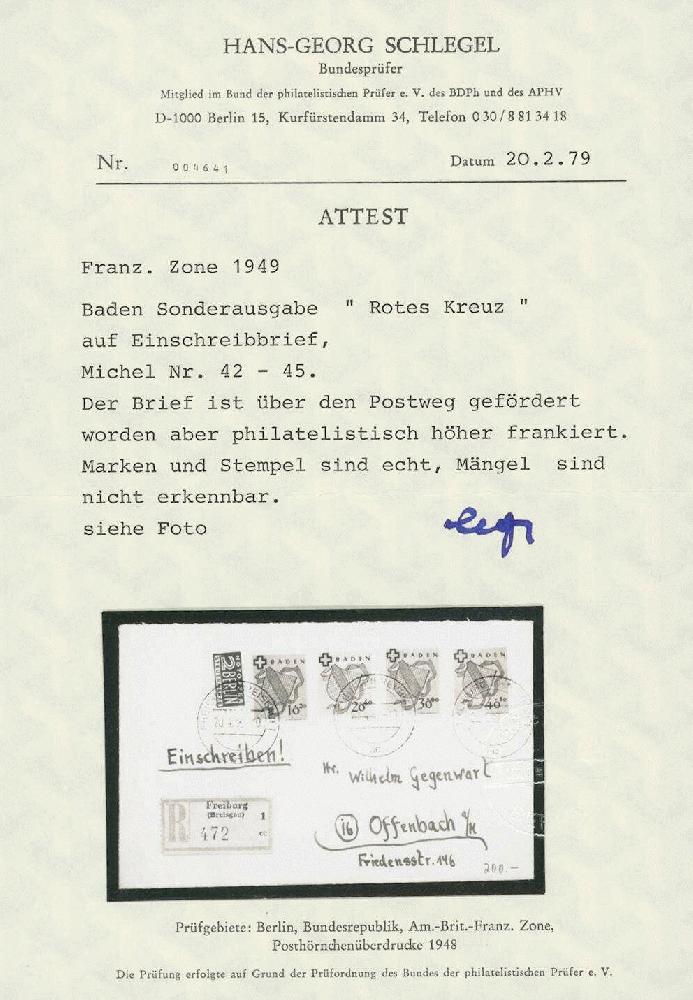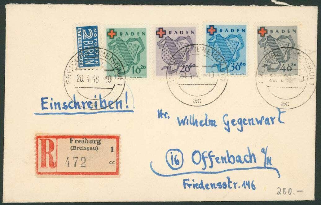 | Zusatzinformationen und Suchstichworte: | Ulrich Felzmann 178. Auktion 22. Juni 2023 Los 3600 Französische Zone Baden Rotes Kreuz kpl. auf R-Brief vom Freiburg (Breisgau) 20.4.49 nach Offenbach (Main) mit Ankunftsstempel, Fotoattest Schlegel BPP, € 400,- Ausruf 100,00 EUR |