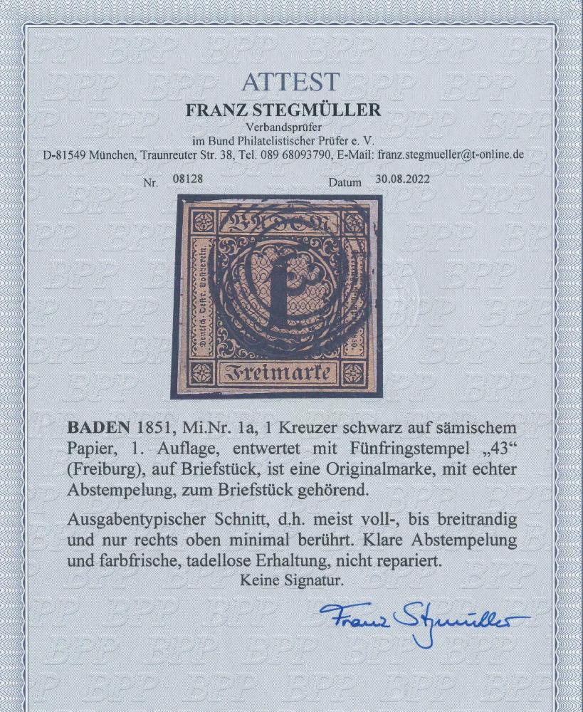 | Zusatzinformationen und Suchstichworte: | Wohlfeil 85. Auktion 16. - 17. Juni 2023 Los 10 Altdeutschland Baden 43 FREIBURG top klar u.voll a.1 Kr., Fotoattest BPP STEGMÜLLER " Stempel echt, meist voll / breitrandig, nur re.oben minimal berührt, tadellose u.farbfrische Erhaltung, nicht repariert " Ausruf 225,00 EUR |