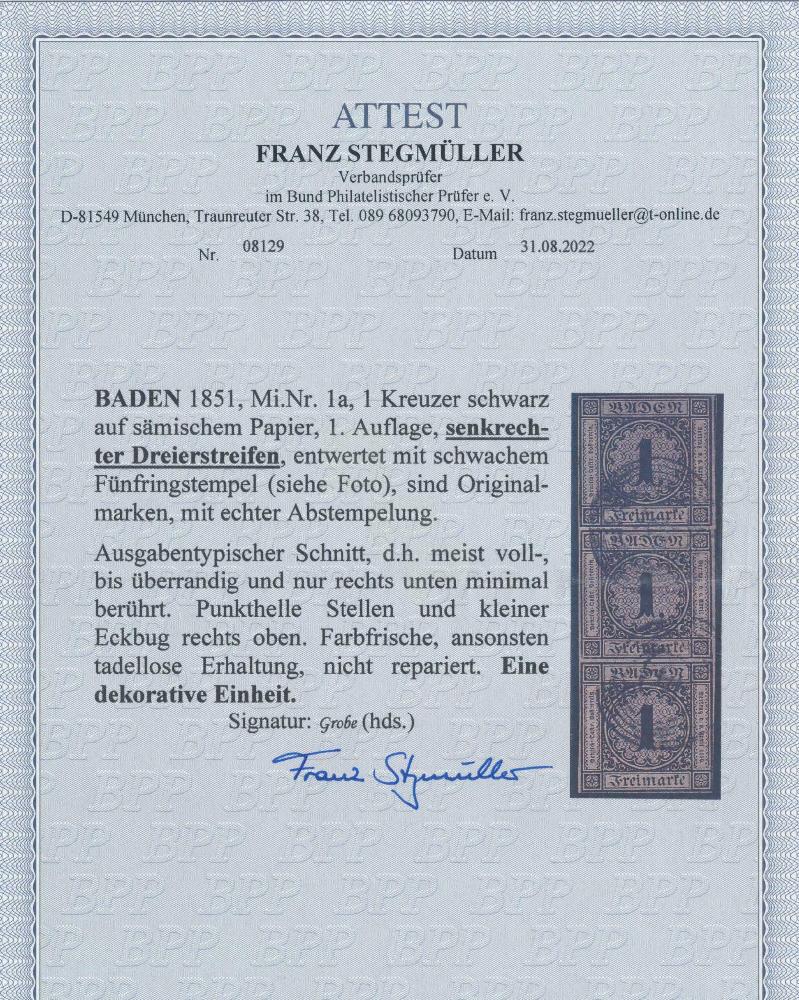 | Zusatzinformationen und Suchstichworte: | Wohlfeil 85. Auktion 16. - 17. Juni 2023 Los 11 Altdeutschland Baden 1 Kr.i.senkr.3 erstreifen m.2 Ringstpln., Fotoattest BPP STEGMÜLLER " Stempel echt, meist voll / überrandig, nur re.unten minimal berührt, punkthelle Stelle u.kl.Eckbugspur re.unten, farbfrische Erhaltung, nicht repariert, dekorative Einheit " ( 3600.- ) Ausruf 970,00 EUR |